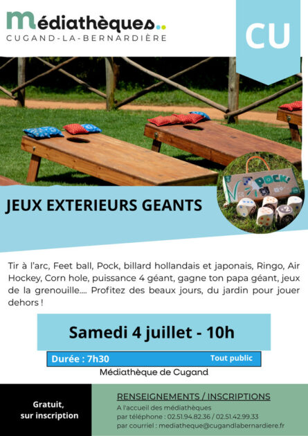 Tir à l’arc, Feet ball, Pock, billard hollandais et japonais, Ringo, Air Hockey, Corn hole, puissance 4 géant, gagne ton papa géant, jeux de la grenouille…. Profitez des beaux jours, du jardin pour jouer dehors !