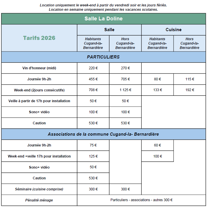 La salle de la Doline est équipée d’un bar indépendant de la salle, d’une cuisine, d’une estrade. Le contrat de location est à établir à la mairie.